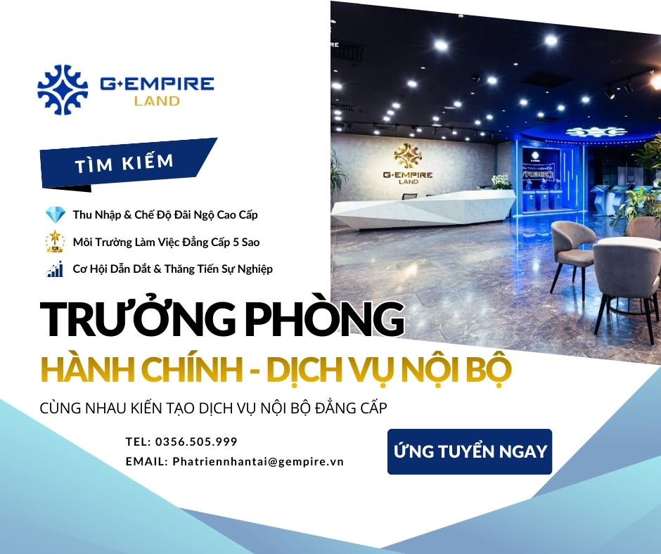G.Empire đang tìm kiếm một Trưởng phòng Hành chính – Dịch vụ Nội bộ để thiết lập và duy trì môi trường làm việc không chỉ chuyên nghiệp mà còn đạt tiêu chuẩn dịch vụ 5 sao dành cho toàn bộ nhân viên. Nếu bạn đến từ môi trường Hospitality/Luxury, có tư duy tinh tế và khả năng bao quát toàn diện, chúng tôi rất mong được hợp tác với bạn.
