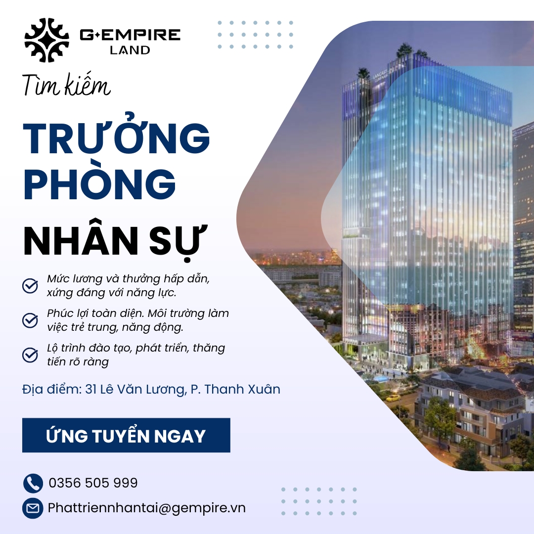 G.Empire Group đang tìm kiếm một quản lý tài năng cho vị trí Trưởng phòng Nhân sự. Nếu bạn là người có tư duy chiến lược, am hiểu đặc thù ngành BĐS và mong muốn xây dựng một đội ngũ vững mạnh, hãy gia nhập cùng chúng tôi.